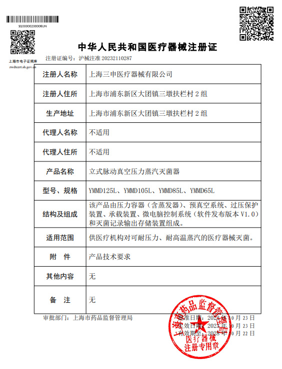 立式脉动真空压力蒸汽灭菌器注册证