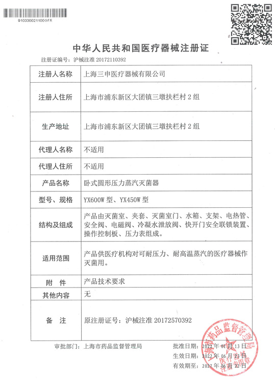 卧式圆形压力蒸汽灭菌器注册证