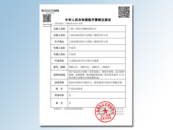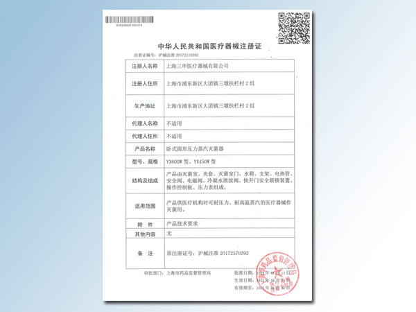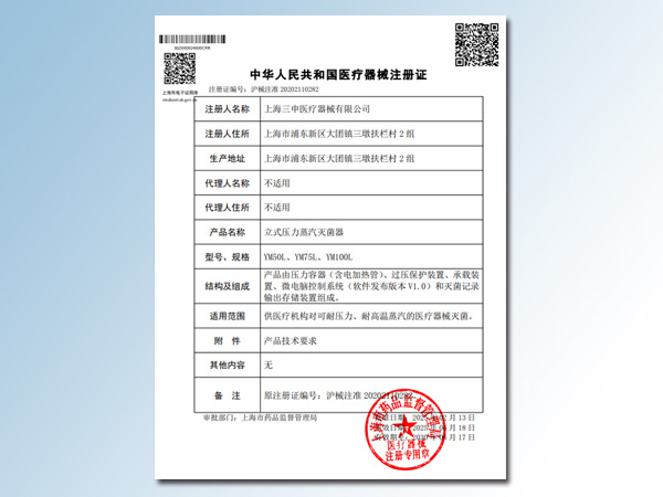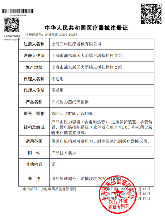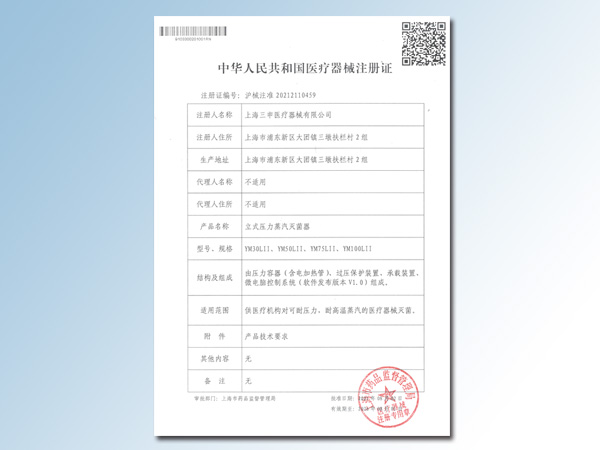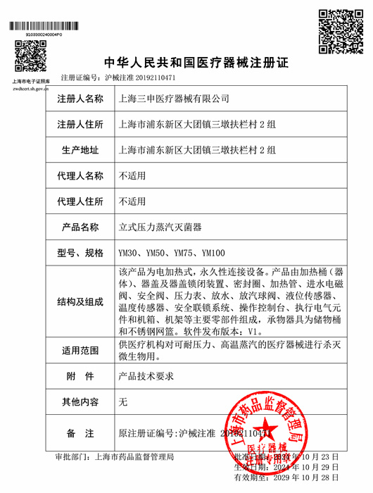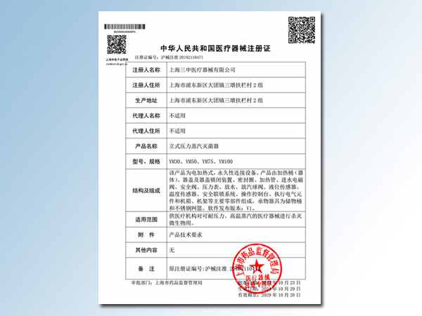 YM立式压力蒸汽灭菌器注册证