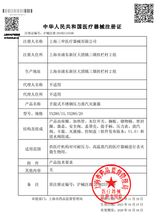 手提式不锈钢压力蒸汽灭菌器注册证
